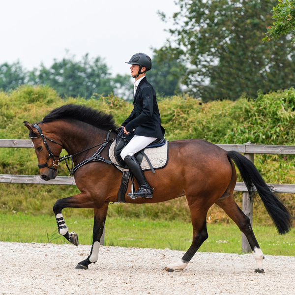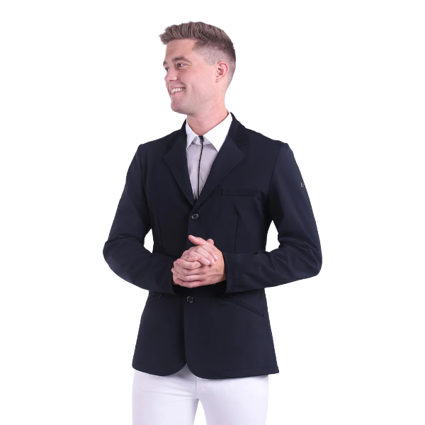 Sporty competition jacket with mesh under the arms, on the back and collar. This makes the jacket very airy, which is perfect for the summer. The jacket has a hidden zip behind the button closures. In addition, the jacket has two subtle zip pockets on the front.