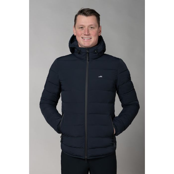 This stylish men’s quilted jacket offers the perfect blend of protection, comfort, and modern design. The high-quality Dupont filling ensures excellent warmth, while the waterproof outer fabric (5000 mm) and high breathability (5000 g/m²/24h) provide optimal protection against wind and weather. The water-repellent logo zipper and practical 2-way zipper allow for maximum flexibility. Essential items can be securely stored in the discreetly integrated zip pockets in the dividing seams. The hem and sleeve cuffs are edged with elasticated tape for a perfect fit. The hood can be individually adjusted with an elastic drawstring and cord stoppers and secured with a snap button. Stylish details such as the logo badge on the left sleeve and the subtle horse embroidery on the chest add an exclusive touch.